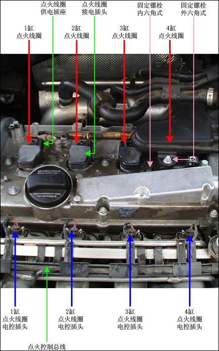 圖3中,我為大家標出了點火線圈和相關部件。圖片是從車頭位置向車尾方向拍攝的,從右到左順序紅色箭頭指示的分別是1,2,3,4缸的4個點火線圈,安裝入發動機總成后從上面只能看到其插頭的黑色塑料部分。