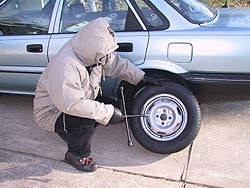為了更換輪胎,必須把汽車支起來。首先把千斤頂搬出來,牢固地支在車體的指定位置上,然后用千斤頂把汽車支起來。一邊升高千斤頂,一邊觀察輪胎的著地狀態,在輪胎快要脫離地面之前,停止升高千斤頂,使用車輪固定頭套筒板手,把緊固螺母擰松。如果緊固螺母過緊,用手不能擰松,可以用腳踏動車輪固定頭套筒板手,利用體重把緊固螺母擰松。