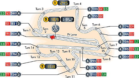 在F-1從傳統(tǒng)的歐洲積極的向外拓展版圖的前提下,Sepang從1999年起成為F-1的新賽站。亞洲原本會新建兩個賽站,但是中國站卻因故暫緩,然而馬來西亞站卻沒有因經(jīng)濟困難及政治因素而延誤。 Sepang賽車場距離馬來西亞首都吉隆坡約65公里,初期建造經(jīng)費就達1.2億美金,在1998年11月完工。場方宣稱這是座擁有最高級的觀眾席及高科技的設備的F-1賽車場。數(shù)個高速彎角、兩條長度800公尺速度可超過300km/h的直線路段,以及幾個不錯的超車點對車手都是挑戰(zhàn),這個賽道的設計兼顧了車手與觀眾,直在線的主觀眾席可容納30,000人,其他區(qū)域則可容納80,000人,為車隊提供了舒適的維修區(qū)也為媒體提供了高科技的新聞中心,堪稱是全世界最好的賽車場。 起跑直線道可達6檔303kph,直線路底急減速降至2檔85kph通過第1彎道,隨之而來的是一個2檔70kph的左彎;接著大腳油門通過帶右彎的加速路段,此處的側向G值達2.2,在進入下個彎道前速度可達6檔290kph;重踩剎車退至2檔103kph進入第3個彎道,側向G值2.5。隨后要通過困難的S彎道,第一段以4檔225kph通過,稍放油門以4檔174kph通過第二段。接著在到達下一個彎道之前可達5檔270kph,然后以4檔193kph通過第7個彎道,此處的側向G值為最高的2.8,接著馬上就是4檔200kph側向G值2.2的第8彎;隨后又是一小段直線,速度可達5檔267kph,然后又必須急減速到2檔65kph通過很急的第9彎道。加速退出這個彎道之后可打上4檔,但隨即必須降回2檔進入第11彎角,以時速124kph通過,此處側向G值為2.2,之后可加速到4檔256kph。 第13、14個彎道是很重要的連續(xù)右彎,這里影響了進入起跑直線的速度,先以3檔176kph通過第13彎,這里的側向G值也高達2.8,接著在彎中退至2檔114kph通過第14彎,隨即進入第2條直線路段,到路底可達6檔290kph,最后以2檔106kph通過發(fā)夾彎沖向終點。