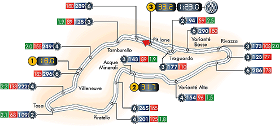 Imola賽道是16場比賽中第二個反時針走向的賽道,起跑之后直到第1個彎道減速前可達7檔289kph,第1個彎道Tamburello為一個S型減速彎道,賽車要減速到3檔128kph通過,然后加速前往Villeneuve彎道,Villeneuve彎道也是個S型減速彎,在入彎前可達7檔296kph,然后大腳煞車降到2檔135kph通過。