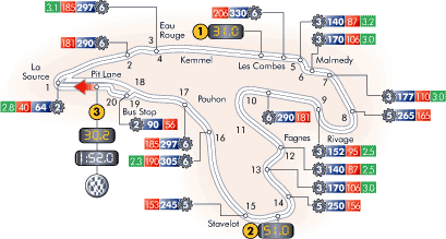 [賽道簡介] 位于比利時的中心,斯帕-法蘭高堪斯(Spa-Francochamps)賽車場自從1985年開始就舉行比利時格蘭披治賽。就像加拿大那樣,它只是一個半永久性的賽車場,使用上了部份的公路。這是一個既漫長又艱難的賽車場,尤其是下山路段,往往會令人心跳停止。對付斯帕需要用上一個中至低的下壓力調校。 SPA賽車場常被形容為世界上最佳的賽道,提供世界上最佳的賽車演出。一方面因為Spa-Francorchamps的坐落的地點很好,一方面因為經常下雨,而且下在跑道的一邊,另一邊卻還是乾的,所以這是一場注重車隊戰略的比賽。此外若要到SPA觀賞F-1比賽,最經典的位置就是在Eau Rouge,那會是永生難忘的經驗,所以這個區域的票價特別貴并不是沒有原因。 La Source發夾彎就在起跑后不遠處,很多車手都會因為事故而在此退出比賽。 到達Eau Rouge速大可達305 km/h,下坡后車手輕點剎車后進入彎角,之后開始上坡,上坡前時速為290。很多車手都希望在Eau Rouge提高出彎速度以便在緊接而來全場速度最高的路段有更好的表現,但事實上只有少數車手能夠全油門出彎。 在Kemmel速度可高達350,然后必須重踩剎車后進入Les Combes彎,這里是個很好的超車點。這個先右后左的復合彎道平均速度為3檔140,出彎時可上4檔速度175。Rivage是一個下坡而且顛頗的彎夾彎,如果遇到下雨很多車手會在這里沖出跑道提早收工。之后的Pouhon彎進出彎的速度都是230,出彎后的小直線上速度又可達到300,然后會遇到Fagnes湯匙彎,一個先右后左的減速彎,以180通過。 Stavelot是一個連續的右彎,以3檔入彎,4檔260出彎,Blanchimont是一個長的左彎,以速度310出彎后在進入直線前會遇到"Bus Stop"湯匙彎,這是全場最慢的一個減速彎道,通過之后就進入直線完成一圈。 [歷屆冠軍] 2001:邁克爾·舒馬赫 [法拉利] 2000:哈基寧 [麥克拉倫] 1999:庫特哈德 [麥克拉倫] 1998:達蒙·希爾 [喬丹] 1997:邁克爾·舒馬赫 [法拉利] 1996:邁克爾·舒馬赫 [法拉利] 1995:邁克爾·舒馬赫 [貝納通] 1994:達蒙·希爾 [威廉姆斯] 1993:達蒙·希爾 [威廉姆斯] 1992:邁克爾·舒馬赫 [貝納通] 1991:塞納 [麥克拉倫] 1990:塞納 [麥克拉倫] 1989:塞納 [麥克拉倫] 1988:塞納 [麥克拉倫]