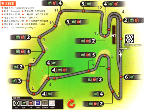 Hungaroring賽道原本全長僅3.975公里,但是在2003年首次坐了大幅的修改,全長變成4.381公里,比賽圈數(shù)由原本的77圈減少為70圈。彎彎曲曲的賽道設(shè)計讓平均速度不高,屬于中低速型賽道,輪帶的磨耗相當(dāng)大,因此Pit stop通常會采至少兩停策略。由于比賽通常在夏日炎熱的天候下進(jìn)行,對于車輛與車手本身都是一種煎熬,坐在溫度高達(dá)50度的F1駕駛艙中,比賽時一直保持專注是相當(dāng)關(guān)鍵的。