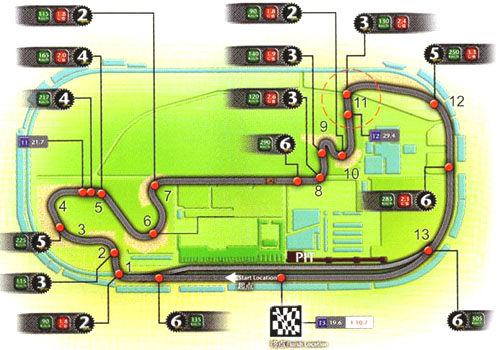 通過以磚頭所砌的起跑線之后,賽車以6檔320km/h的高速?zèng)_向第一個(gè)彎道,隨后就進(jìn)入橢圓形賽道內(nèi)部的多彎部分;大腳煞車減速到2檔96km/h通過第1個(gè)彎,小補(bǔ)油門后再減速到2檔88km/h通過第2個(gè)彎道;然后加油門以4檔210km/h通過第3個(gè)高速彎道,接著減速到4檔128km/h過第4個(gè)彎,加速到4檔225km/h,又減速到4檔168km/h過第5個(gè)彎;一小段加速之后來到兩個(gè)2檔的連續(xù)彎道,先以120km/h通過第6彎,然后以112km/h通過第7彎;然后是一段不短的直線道,賽車可達(dá)6檔296km/h;接著進(jìn)入速度更慢的路段,先是急煞車到3檔120km/h通過第8彎;接著是兩個(gè)時(shí)速僅有2檔80km/h與96km/h的第9、10彎,接著加速到3檔128km/h通過第11彎;到此準(zhǔn)備進(jìn)入橢圓形賽道部分,賽車以近乎全油門狀態(tài)通過第12與13彎往終點(diǎn)沖去。