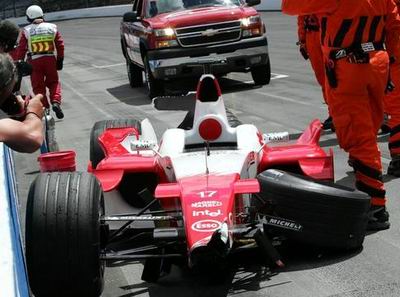 北京時間6月18日03:00,F1美國大獎賽第二次練習賽在印地安納波利斯賽道進行。當比賽進行到12分鐘時,豐田車手拉爾夫-舒馬赫由于左后輪爆胎導致高速撞墻,失控的賽車在同水泥墻碰撞后鼻錐被擠壓的粉碎,左側懸掛全部斷裂。而出事地點與他去年在美國大獎賽正式比賽中發生嚴重事故的地點幾乎相同。賽道上立即出示了紅旗,小舒馬赫在沒有人協助的情況下從他那輛嚴重損壞的TF105賽車爬了出來。圖為現場組圖。