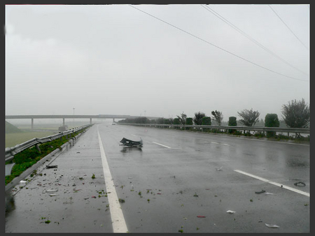 撞擊位置全景,左側隔離帶有明顯撞擊痕跡