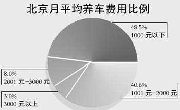 調查顯示,90%的車主認為汽車大大增加了生活負擔。養車費用包括保險費、養路費、油費、過路費、停車費等。調查結果顯示1000元成為車主月平均養車費用的一道分水嶺。月平均養車費用在1000元以下的比例達到48.5%,超過千元的比例則為51.5%,其中,月平均養車費用在1001-2000元的比例為40.6%,月平均養車費用在2001-3000元以及3000元以上的比例分別為8.0%和3.0%。相對而言,月平均養車費用在2000元以上的比例較少,其中微型轎車月平均養車費用主要集中在1000元以下,車主比例達到79.0%。