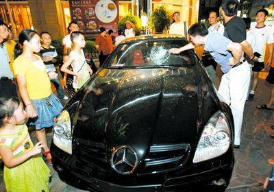 “我的車頂被砸爛,最少也要賠100萬!”受損的奔馳車主劉先生顯得情緒很激動,他稱奔馳轎車是新買的。