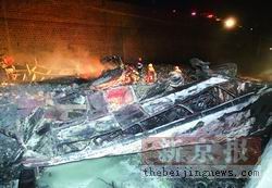 圖為發(fā)生事故的大客車已經(jīng)被完全燒毀