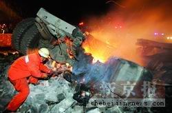 昨晚11時,在八達(dá)嶺高速進(jìn)京方向不斷有救護(hù)車和警車來回行進(jìn)。在昌平區(qū)南口鎮(zhèn)山羊洼地段,即在進(jìn)京方向約49公里處,數(shù)十輛救護(hù)車、消防車、警車聚集當(dāng)場,公路護(hù)欄被撞斷二三十米,護(hù)欄下的溝內(nèi),兩車仍在著火。其中一貨車趴在亂石堆上,車頭和車身窩在一起,另一輛客車倒在水里,外殼被燒黑,只可看見里面的座位,記者在現(xiàn)場看到,有一具尸體趴在客車旁的水里。