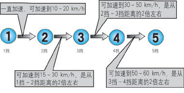 4、各種車輛需根據車速的不同選擇相應的擋位,尤其對于手動擋的車型更是如此,現在市場上的新車型大都采用了高轉速發動機,換擋時機最好掌握在發動機轉速2 500~3 000 r/min范圍內(具體換擋時機還請根據汽車生產廠商給出的發動機轉速數值、車速及發動機噪聲判斷)。目前市場上大部分手動擋車型為5前進擋手動(國產車型中,目前僅一汽轎車的Mazda6 有6前進擋的手動擋車型),以市場上常見的一汽-大眾捷達為例,其擋位對應的車速如圖所示。
