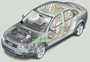 這是一輛A4的車體剖圖。其前部車廂結構采用高強度鋼材加強了抗正面碰撞能力,尤其是加強了抗凹陷能力從而保證了安全的腳部空間;側面門檻加入擠壓成型的鋁結構件、提高抗側撞能力。高強度座椅提高抗側撞能力,而且高強度鋼的A、B柱可有效地抵抗翻滾及側撞帶來的車身變形。