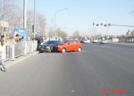 從圖中可以看出,QQ損失慘重:右前車頭已經完全變形,保險杠、前隔柵、水箱無一幸免,發動機艙蓋高高的拱了起來。不過幸好撞的是右前方,而且力度不大,QQ的駕駛艙沒有變形,駕駛員沒有受到傷害。