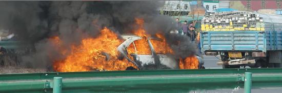 火向整個車身蔓延,火焰躥起有五六米高。“砰———”地一聲,一只輪胎爆了,出現一團火球,接著又是一團火球。場面燒得很大,使得路過車輛都遠遠停下,圍觀。