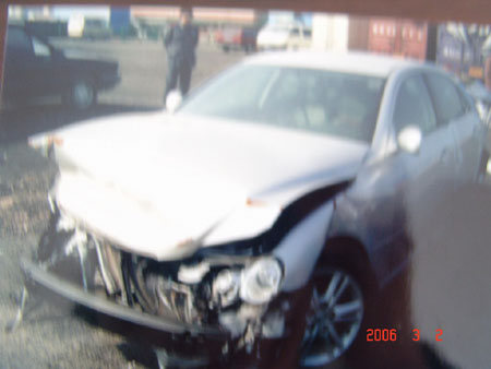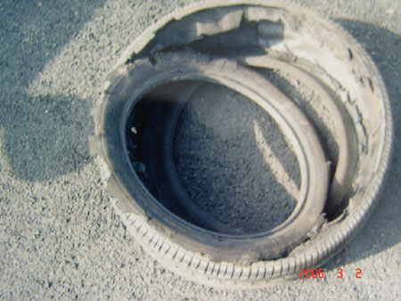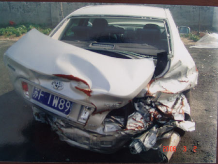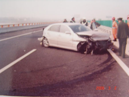 當(dāng)天中午風(fēng)和日麗,11:10我沿剛通車不久的寧啟高速公路由南通開往啟東辦事,臨近春節(jié)高速公路上車輛稀少,當(dāng)我以車速110公里/小時(shí)的速度行駛到下下行線326KM處,左后輪突然爆胎導(dǎo)致車輛失控。我平時(shí)是個(gè)十足的車蟲,對(duì)駕駛很有感覺,首先的反應(yīng)是死命把住方向盤,車的抖動(dòng)實(shí)在太厲害,就這樣一直堅(jiān)持了100多米還是沒有控制住車輛,隨后就發(fā)生了多次旋轉(zhuǎn)撞擊兩側(cè)護(hù)欄……事后了解到這種事故的死亡率一般都在90%以上,在氣囊未打開的情況下我憑借扎實(shí)的駕駛技術(shù)死里逃生,而且是毫發(fā)未損。