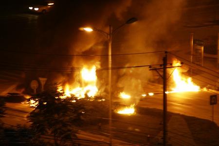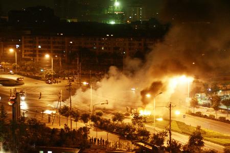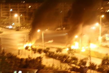 睡夢中被震耳的爆炸聲驚醒,開始沒明白怎么回事,以為自己做惡夢,后來再琢磨,不對,一定發生什么了。跑窗戶跟前向外望,剛剛開張的望京購物中心前的那個十字路口,火光一片。隨之又是一個震耳的爆炸聲,趕緊取出相機拍下這樣的場面,拍攝時間6月15日凌晨2點39分。