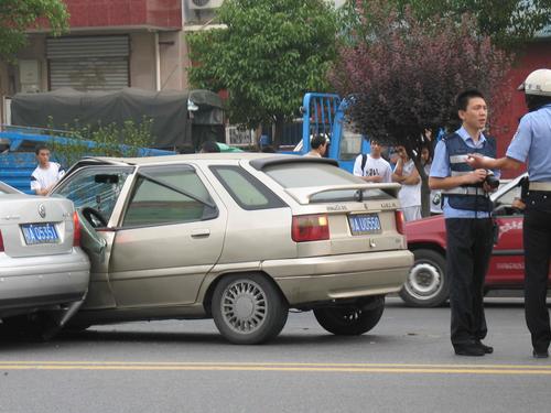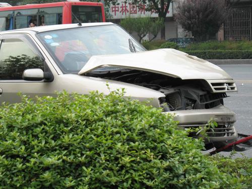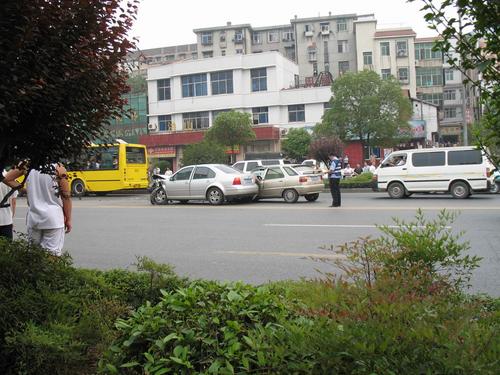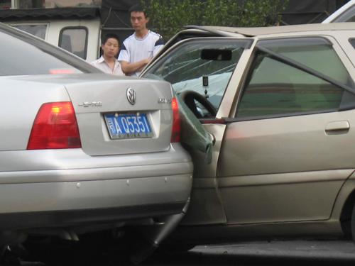2006年湖北省武漢市洪山區卓刀泉珞瑜路上的一起猛烈的車禍。同屬“老三樣”,同樣以皮實肉厚著稱的寶來和富康,這一回結結實實撞在了一起。兩車側撞,誰也不討好。寶來前臉盡毀,富康的前臉和車門也已被撞得不成形狀。即使是皮實的“老三樣”,也是禁不住猛烈的撞擊的。行走江湖,安全第一,行車路上,還是謹慎駕駛的好。