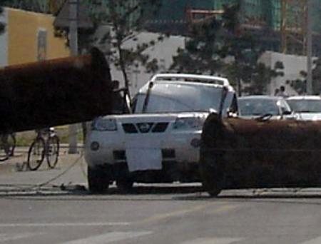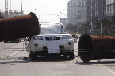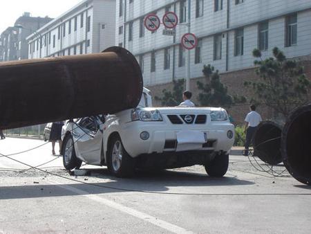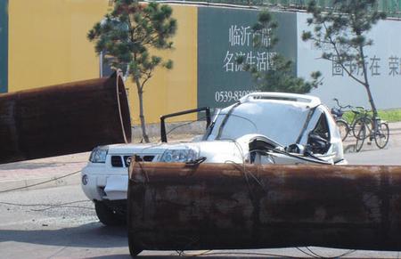 昨日清晨7點50許,在臨沂金雀山二路與既邱路交匯處路口,一輛正要通行該路口的白色日產奇駿越野車,被路南某公司供氣轉換站突然發生傾斜的煙囪正中砸到,整輛奇駿的駕駛艙被直徑2.5米的鋼管旱制的煙囪砸癟,車輛基本報廢。