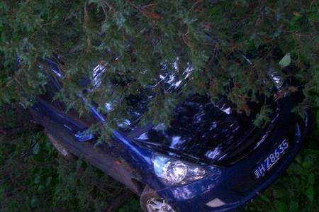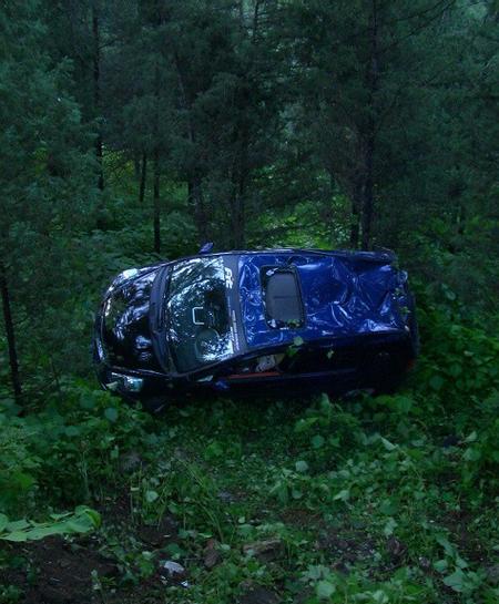 原因:Z行連續2個90度彎道,不到10米寬山路,過第一個彎后看后視鏡(我是頭車)所以造成第2個彎打輪過晚,失控翻下山。從我下溝離開地面的時候離車固定下來的地點,大約是20米,也就是說我打了20米的滾,溝離路面5米左右,滾了2圈落地掛樹上,如果沒有樹我就再也發不了帖了,第一次落地是左頂部,我車里就我一個人,一絲傷都沒有,車沒死火,是我自己滅的車。