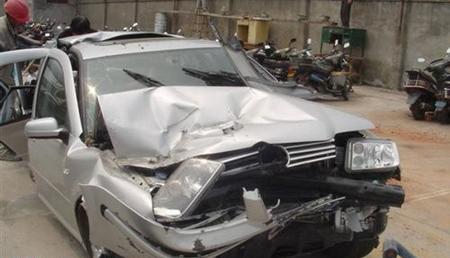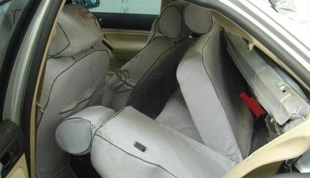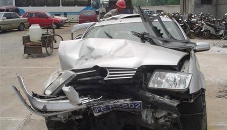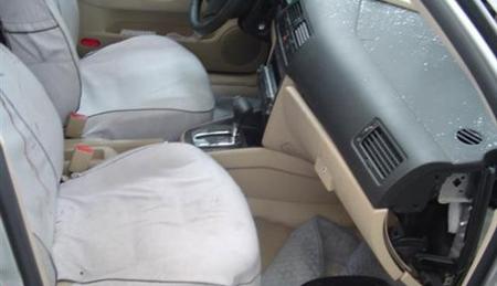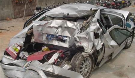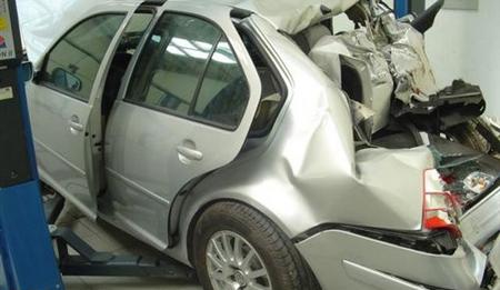 這起事故中寶來車嚴重損傷,但令人驚訝的是,寶來車里的三名乘員除了坐在副駕駛位上的因措不及防(沒系安全帶)下巴撞上儀表盤而需住院觀察外,其余兩人均僅受皮外輕傷,簡單包扎一下就出院了。現在,讓我們來看一看這輛寶來的照片。