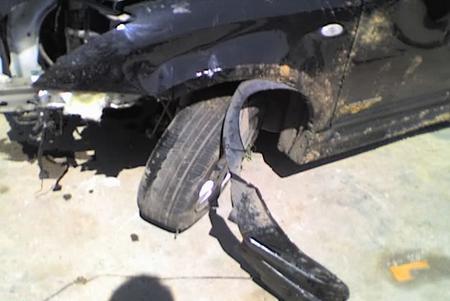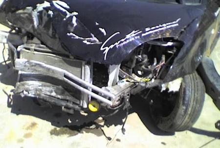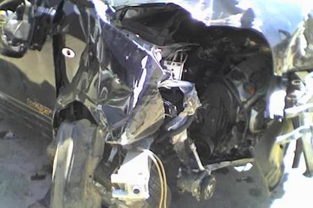 據車主本人說在山路上最高開到140KM,在一彎道上以較快的速度與一卡車相撞,車車被撞得轉了幾個圈,然后翻到路邊的坑里,車上三人,都系了安全帶,無人受傷。