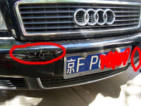 我當時下來,心里一定想“完了!后屁股沒了!!”結(jié)果轉(zhuǎn)到尾部一看,還好,屁股還在,傷看上去不大,就是排氣管歪了,已經(jīng)變形了,外傷看起來不嚴重,那A8真結(jié)實啊!只留下保險杠上一道劃痕而以,還有就是A8的左前霧燈撞在我排氣管上了,結(jié)果霧燈的罩飛出去了,我的排氣管也歪了……