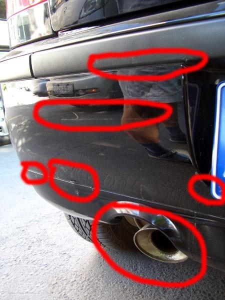 后保險杠有幾處劃傷、保險杠變形、排氣管變形彎曲、后杠鐵變形、我的牌照一角變形、小黃牌有個坑(A8前杠撞得)等。