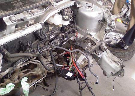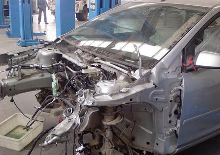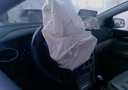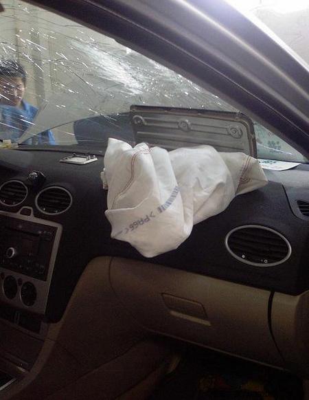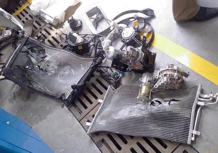 車人損傷:就在這一瞬間(兩秒左右)我第一感覺就是雙氣囊一一打開了,發動機已熄火,我的左上額鮮血直流(后在醫院縫了22針),是因為沒有系安全帶,在撞擊的那一刻我慣性前沖,頭碰到了前遮陽板的掛鉤上了,而副駕那邊在氣囊的保護下只是頭與前擋接觸,前擋玻璃被頭碰裂幸好貼了防爆膜人沒有受一點傷。后坐上的人在前沖那一刻直接將我的靠背(坐椅靠背)撞成了麻花型,人卻沒事。小福的前臉及水箱,空調散熱器等前置器件已報廢。發動機和變速箱的吊耳撞斷但機子沒有事。