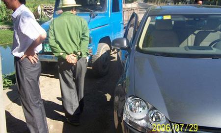哪里知道,一輛裝豬屎的農用車“突、突……”地開過來,繞過本某車身的時候提前打了方向,“哐當”一下刮蹭到本某的左前輪輻。本某下車便追上去,哪里知道這家伙“突突”到30多米外才停住,本某走到一半,它又開始“突突”地跑了!本某趕緊回到車上,立即追上去,并行將近50米,車上三個人都打開窗子讓豬屎車停下來,就是不停,還在“突突”地跑。