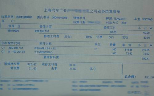 我去4S店更換了前剎車片 花了差不多400大洋(圖文)