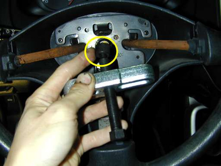 其實它就是利用反作力的原理,來將緊杯接合物分離。可用利用一般的板手旋轉,即會將方向盤迫出。注意一點,之前有說到螺帽只要放松竀牙,是為了要保護中心柱的牙不受到拆卸工具的壓迫而受損。如此一來即使中心螺牙有壓迫而變形,也可利用螺帽旋出時將牙重新導正。一般方向盤與中心柱接合的地方為?型構造,所以只要逼出一點點距離,即可分離。