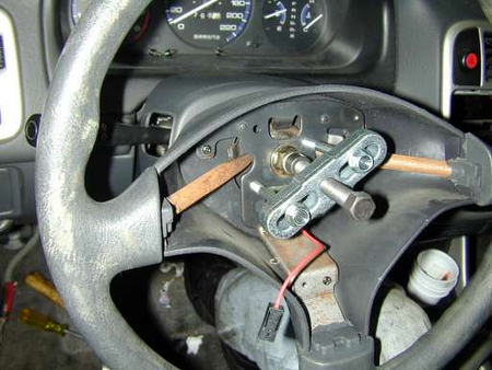 拆下必要的裝置,之后一定可以看見中央螺絲周圍有2~3螺絲孔,這是用來拆卸方向盤用的。準備好工具,注意一定要安置好婄套,否則很容易使螺帽或螺牙受損。