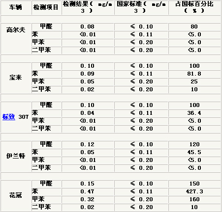 在經過檢測的五種車中,結果最令人滿意的是一汽大眾高爾夫,它的各項有害物指標均遠低于國家標準,東風標致307、一汽大眾寶來緊隨其后,這三款車的有害物指標都沒有超過國家標準;伊蘭特和花冠的檢測結果并不理想,伊蘭特車內空氣甲醛超標,達到標準值的120%;而花冠的甲醛、苯、甲苯的單位含量都超過了標準,而且幅度相當大——苯的含量竟達到了國家標準的427.3%、甲苯和甲醛也都高達160%和150%。