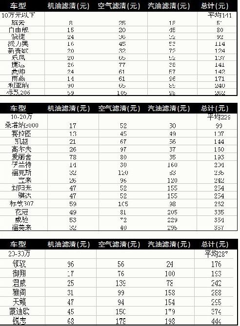 由于工時費因各廠家的規定各有不同,記者就京城32款主力車型的三濾成本費用進行了調查。