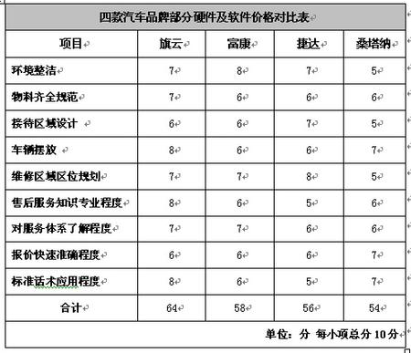 電話采訪的結果顯示,桑塔納4S店在報價的快速準確程度方面是表現最突出的一個,工作人員能很快地告訴顧客配件的價格,后期的價格查證證實他們的報價跟店內的維修價格是一致的。旗云的4S店也準確地報出了配件價格,但如果在追求準確的同時能夠兼顧客戶節省時間的需要,就更好了。捷達的4S店在電話中并沒有報出價格,他們要求車子進了4S店再議價格。富康4S店報價倒是挺及時,可惜并不怎么準確。