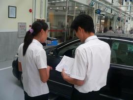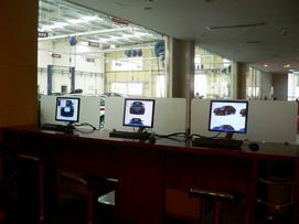 如果沒有問題,在和車主進行確認之后,鎖上車輛,將車主帶入4S店內的接待處,填寫車主資料,將要保養的項目錄入i-CROP系統。緊接著,店內的其他工作人員會送上一杯飲料(咖啡、茶、可樂、純凈水等等),填寫好資料之后客服人員將客戶帶到休息區,稍做休息。在休息區,我么可以看到,有一臺等離子電視和三臺可以上網的電腦,客戶可以自由選擇。當然客戶也通過等離子電視連接CS系統觀察自己的愛車目前正處在什么樣位置,進行什么樣的工序。筆者再次回到接待處,可以看見,客服人員已經將車主的維修項目錄入SMB系統,維修主管在后臺車間第一時間可以看到車型、車號,需要做什么樣的服務。