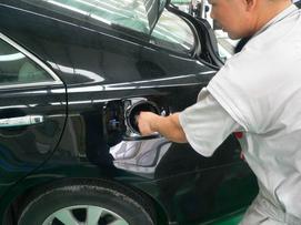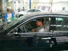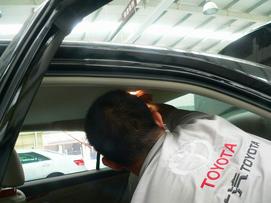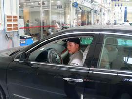 保養工作正式開始,首先主維修人員坐入駕駛位,對車內的每一項功能都詳細檢查,看看是否有異常的地方,筆者可以看出,這次的檢查要比先前客服人員進行的更為仔細,包括與副維修實時交流,看看凱美瑞的前燈后尾燈、雨刮、噴洗機等的各項功能是否工作正常。在檢查完這些設備之后,主維修人員下車檢查前后車門開關、兒童鎖、安全帶、閱讀燈及油箱開關。我們發現,主維修人員只檢查左邊部分,而此時的副維修人員呢?他在做什么······