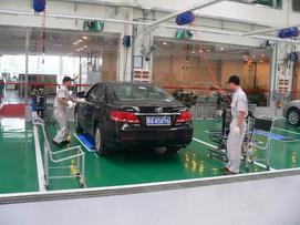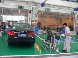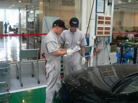 為了能夠快速準確的完成首保工作,一般保養車輛是由兩位維修人員同時進行,我們首先看到主維修人員將車輛開到快速保養車位,主維修人員再向副維修人員傳達維護信息。此時的工位的兩臺系統化臺車已經準備就緒,連接好風炮、油管等設備。我們下面的圖片中可以看到,兩臺系統化臺車的初始擺放位置都是非常規范的,一定要擺放在規定的方格內。廣豐4S店的維修車間,什么時候進去都會發現車間非常的干凈,設備材料擺放的十分整齊有序,這也是廣豐能將整個維修過程用玻璃墻的方式展現給客戶的原因之一。