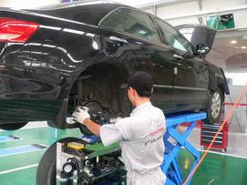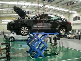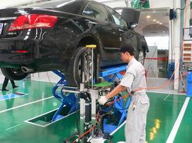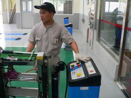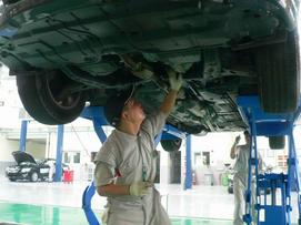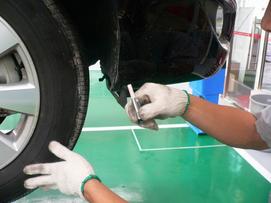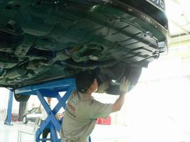 在確認沒有任何問題之后,維修人員首先在維修單上做記錄,然后準備下一步的工作。和副維修人員確認過后,由主維修人員使用升降機將車輛提升到剛好超過頭頂的位置,對車輛的地盤進行檢查(主維修人員檢查前半部分,副維修人員檢查后半部分)。底盤的檢測項目也非常的仔細,檢查輪胎的胎面,測量胎紋深度(一般為8mm),將輪胎里面的小石子清理出來,檢查排氣管、制動管路等等,看看沒有松動或者脫離的地方。