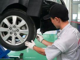 在檢查完車輛底盤之后,來到此次檢測項目的尾聲部分。首先兩位主副維修人員用對角線的方式檢查前后輪胎的軸承有沒有松動,確認沒有后,將系統化臺車移動到輪胎位置,用風炮將輪胎拆卸下來,檢查車輪剎車片,檢查避震器是否正常,用高壓氣槍清理剎車片上面的灰塵。檢查完畢之后換另外一個輪胎,同樣是用對角線的方式檢查,確認沒有問題后,再用系統化臺車將輪胎再安裝上去。