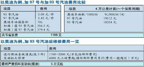 也許有些車主不知,一定量的汽油做的功,真正作用在車輪上的“有用功”,只占5%,剩下的95%功都被車輛自重和必須排出的尾氣“無謂”地排掉和消耗掉了。我們再人為地將其功率降低一些,不是更費油嗎?所以說隨便更改汽車用油標號不但不能起到節油的效果,反而會更加耗油。簡單地說,使用低標號汽油不但不能節油,還會費油,同時動力下降,還會造成發動機損耗和相關維修養護費用。一句話肯定費錢(詳見下表)。