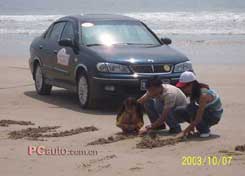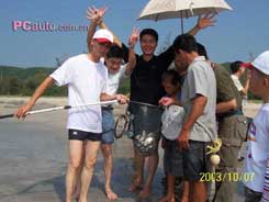 第二天早上,車主早早就來到了海灘,看著遠處的點點漁火,好像在期待著什么?隨著漁火慢慢地接近,車主們也漸漸興奮起來了。哦,原來他們正等著魚回來。終于,漁船回來了。車主趕上去,和漁民一起拉網,一起分享收獲的喜悅。小朋友也過來了,學著漁民樣子,拉起繩子收網。網收回來了,收獲還真不少,有蝦、蟹、尤魚等,最特別是一個大水母,全身透明,還可以看到里面的小魚。車主們拿起小網撿魚,分享著收成的快樂。有一些車主意猶未盡,又和漁民一起向大海出發了。漁船又回來了,猛烈的太陽也擋不住車主們的熱情,車主們和漁民又忙起來了。有的車主在撿魚,有的拿起照相機在給家人和自己留下美麗的回憶。經過兩天的陽光活動后,所有的人都曬了一身的健康膚色,帶著太陽眼鏡的竟給曬出一對白色“熊貓眼”來了。
