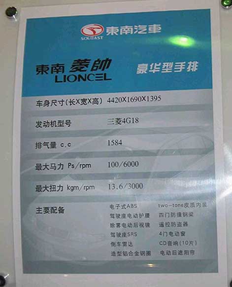 12月7日,菱帥在第五屆廣州國際汽車展覽會正式亮相,東南汽車公司正式公布了業界一直關注的菱帥轎車的售價暫定為10.9到17.9萬,共5款車型。其中10.9萬元的為手動擋車,配備1.3升發動機;12.9萬元的是配置1.6升發動機的手動擋車型;14.9萬元的車型配置手自一體式波箱。