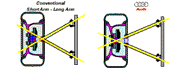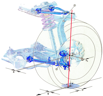 接著我們看看奧迪A4是怎樣消除扭力轉向的,新Audi A-4 四分連結是以在輪子的中線放置轉向軸,其他汽車制造廠也曾試著以別的方式來解釋同樣的問題。Honda以及其他日本和美國的汽車制造廠曾經試著將轉向關結彎曲在輪胎上方,將上支臂(上控制臂)球接頭移至接近輪胎的中線。