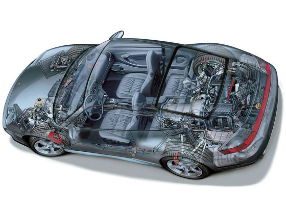 以市面上唯一的RR車保時捷911為例,官方公布的前后車重比是39:61,差不多等于一部反過來的FF汽車,而MR車的重量比則較為均勻,保時捷的Boxster為46:54,法拉力的360 Modena為43:57。雖然有的車廠很欣賞FR汽車可以做到50:50的汽車重量比,操控起來也較得心應(yīng)手,可是從加速的角度來說,還是頭輕尾重的MR和RR最為有利,為了前后重量比盡可能的小,跑車都會采用頭窄尾寬的車身設(shè)計以及采用較為粗大的后輪。