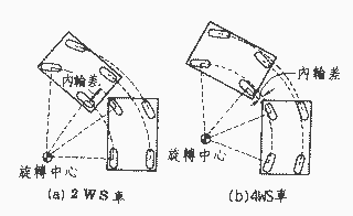 4WS車的情形,是把后輪逆相轉(zhuǎn)向,旋轉(zhuǎn)中心比2WS車更靠近車輛,亦即回轉(zhuǎn)半徑較小。在低速旋轉(zhuǎn),前輪轉(zhuǎn)向角若相同,則4WS車的回轉(zhuǎn)半徑可較小,小轉(zhuǎn)彎性能良好,內(nèi)輪差也可縮小。在轎車時,后輪逆相轉(zhuǎn)向s度,則最小回轉(zhuǎn)半徑約為50公分,內(nèi)輪差可減少10公分。