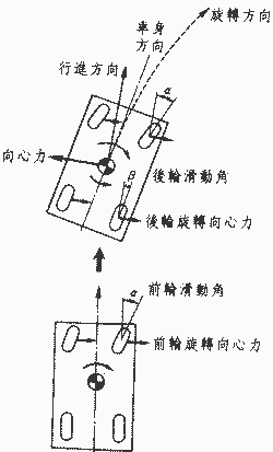 直向行進(jìn)之汽車轉(zhuǎn)彎時,由車輛的重心點變化行進(jìn)方向的公轉(zhuǎn),與該重心點周圍的車輛自轉(zhuǎn)之兩種運動合成來進(jìn)行。圖B 表示2WS車高速旋轉(zhuǎn)時之車輛狀況。首先,若前輪進(jìn)行轉(zhuǎn)向,前輪胎就產(chǎn)生滑動角α,并產(chǎn)生旋轉(zhuǎn)向心力,車身開始自轉(zhuǎn)。結(jié)果,使車身偏向后輪也產(chǎn)生滑動角β,后輪也產(chǎn)生旋轉(zhuǎn)向心力,四輪的力量就分擔(dān)自轉(zhuǎn)與公轉(zhuǎn)力,隨著取得平衡進(jìn)行旋轉(zhuǎn)。可是速度愈高向心力增大,因此與其取得平衡之旋轉(zhuǎn)向心力也不得不增大,給與前輪更大的滑動角不得不產(chǎn)生大的旋轉(zhuǎn)向心力,而且,因為后輪也會給與相似的滑動角,就發(fā)生使車身產(chǎn)生更大的自轉(zhuǎn)運動之必要性。可是,速度愈高更增加車身自轉(zhuǎn)運動之不穩(wěn)定性,容易產(chǎn)生車輛旋轉(zhuǎn)(spin)或橫滑。