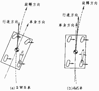在一般汽車,以操縱方向盤使前輪的輪胎轉(zhuǎn)向發(fā)揮轉(zhuǎn)彎機(jī)能,但四輪轉(zhuǎn)向是后輪的輪胎也可轉(zhuǎn)向之系統(tǒng)。四輪轉(zhuǎn)向(4WS:4wheelsteering)之目的,在低速行駛時作逆相轉(zhuǎn)向(前輪與旋轉(zhuǎn)方向為逆向)使旋轉(zhuǎn)時小轉(zhuǎn)彎性能良好,中高速時為同相轉(zhuǎn)向(前輪與旋轉(zhuǎn)方向為同方向),以提高在高速時之車道變換或旋轉(zhuǎn)時操縱穩(wěn)定性。