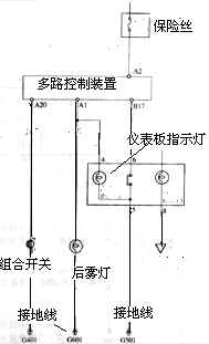 使用多路控制裝置,各用電負(fù)載發(fā)送的輸入信號(hào)通過(guò)電控單元(ECU)轉(zhuǎn)換成數(shù)字信號(hào),數(shù)字信號(hào)從發(fā)送裝置傳輸?shù)浇邮昭b置,在接收裝置轉(zhuǎn)換成所需信號(hào)對(duì)有關(guān)元件進(jìn)行控制。這樣就需在保險(xiǎn)絲、開(kāi)關(guān)和用電設(shè)備之間的電路上添加一個(gè)多路控制裝置(參閱廣州雅閣后霧燈線路簡(jiǎn)圖)。采用多路控制線路系統(tǒng)可以減少線束數(shù)量,還可以通過(guò)ECU對(duì)各分支電路系統(tǒng)進(jìn)行故障檢測(cè)。