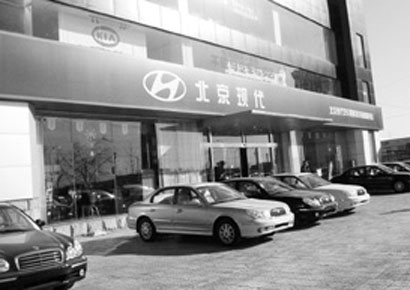 上午9:30,記者來到了位于海淀區杏石口路21號的現代汽車鵬奧特約銷售服務店。這里是現代汽車北京市首批4S特約銷售服務店之一,于2002年年底開業。銷售服務大樓占地8000平方米。雖然展廳外有一個停車場,但已經被占的滿滿當當,其中待售的車占去了一排位置。在保安的指點下,記者把車開進東側一條已經停放了很多車的小胡同里。