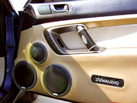 所有功率放大器均采用意大利頂級品牌audison歐迪臣旗下的VrxEX桃木系列,前聲場使用VRx4.00EX和VRx2.400EX與丹麥Dynaudio(丹拿)原裝制造的六只揚(yáng)聲器共同搭配:高音MD-330D、中音MD-140及低音MW160各兩只。遵循聲學(xué)原理控制安裝位置:高音裝于A柱,其定位準(zhǔn)確指向性良好;中音裝于門板,喇叭采用完全密閉式設(shè)計使音質(zhì)不受影響;低音安裝在原車?yán)任,以增?qiáng)低音豐滿音階次效果。